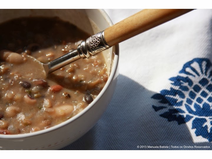 Tenho pena é de só ter comprado meio quilo... mas podemos tentar recriar esta mistura em nossas casas combinando feijão branco, feijão preto, feijão encarnado, feijão raiado, feijão frade, favas secas, lentilhas vermelhas, lentilhas castanhas, ervilhas secas e cevadinha. As proporções é que são um enigma, mas penso que com partes iguais de cada ingrediente não ficará mal.